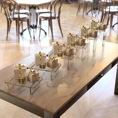 Azar Display’s Deluxe series of Clear Acrylic Risers are elegant and functional as well as versatile. Merchandise and Showcase your products or valuables at varying heights in your store or boutique to create visual appeal. These risers add a touch of fancy and uplift any item that is placed on them. Also perfect for catering weddings, corporate events, parties and special occasions. Or use in your office or home office to elevate your computer and create an ergonomic as well as luxurious work space while maximizing your desk space. There are bumpers on the bottom of each corner leg to prevent sliding or scratching on surfaces. Available in 11 different heights to meet your specific needs. Use these in any retail environment or home or office setting. Sold in Multiples of: 1 Material: Acrylic Overall Measurement: 22W x 10D x 3H Color: Clear Material Thickness: .5 Thick Weight Capacity: 85 pounds