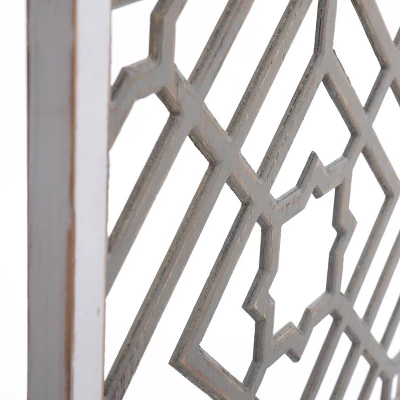 This rustic metal wall hanging is reminiscent of a wall pane in a farm country chapel in its elegant craftsmanship. Finished with a distressed natural wood tone, it features an elegant squared window profile with intricate detailing. Hang it on any wall to lend a certain old world flavor to any room.